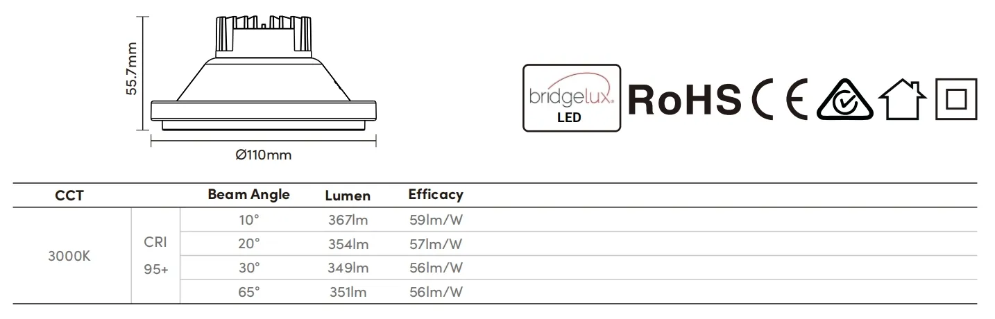 ♦ Fit in AR111 and CDM111 standard downlight converters.