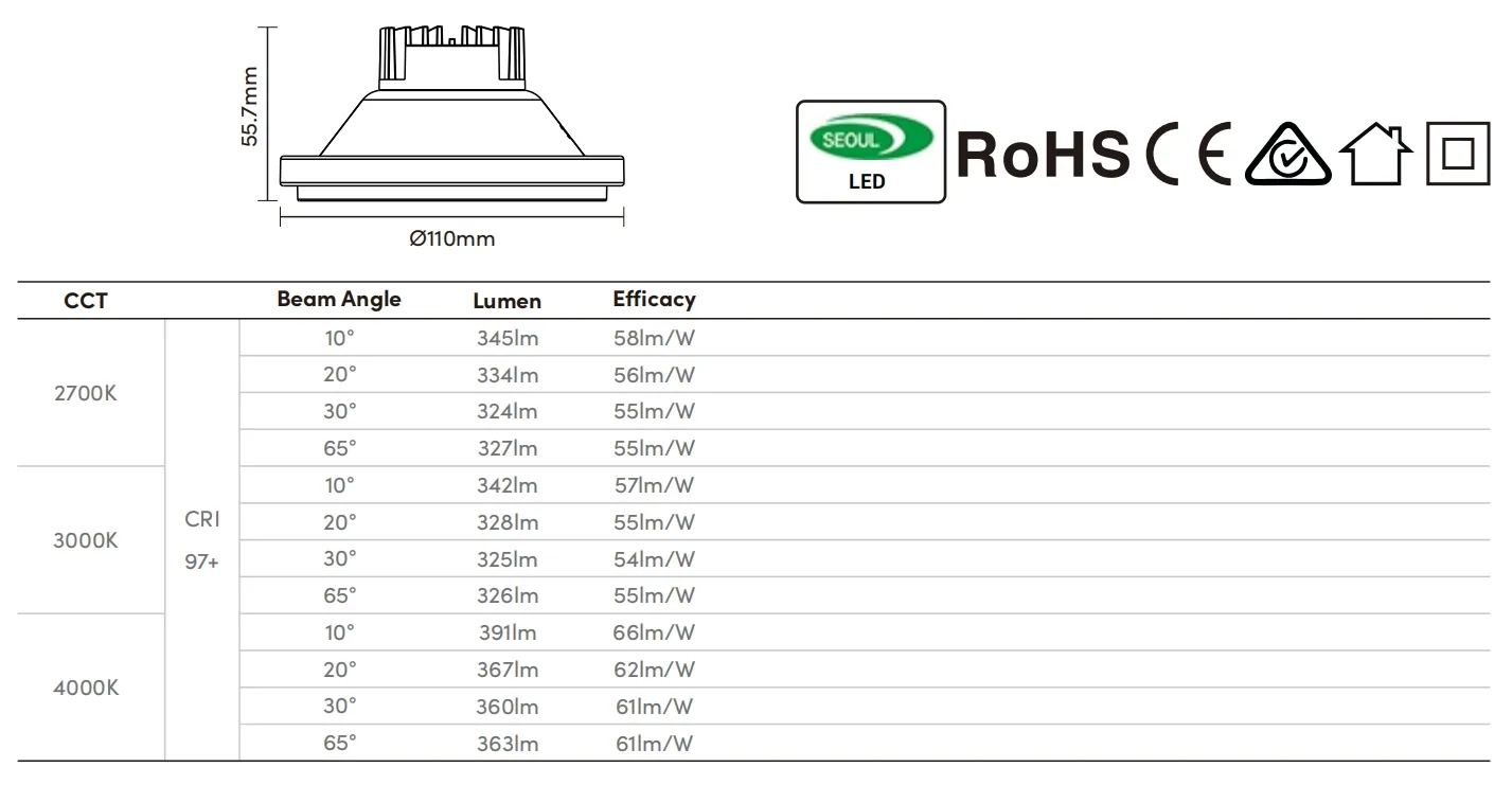 ♦ Fit in AR111 and CDM111 standard downlight converters.