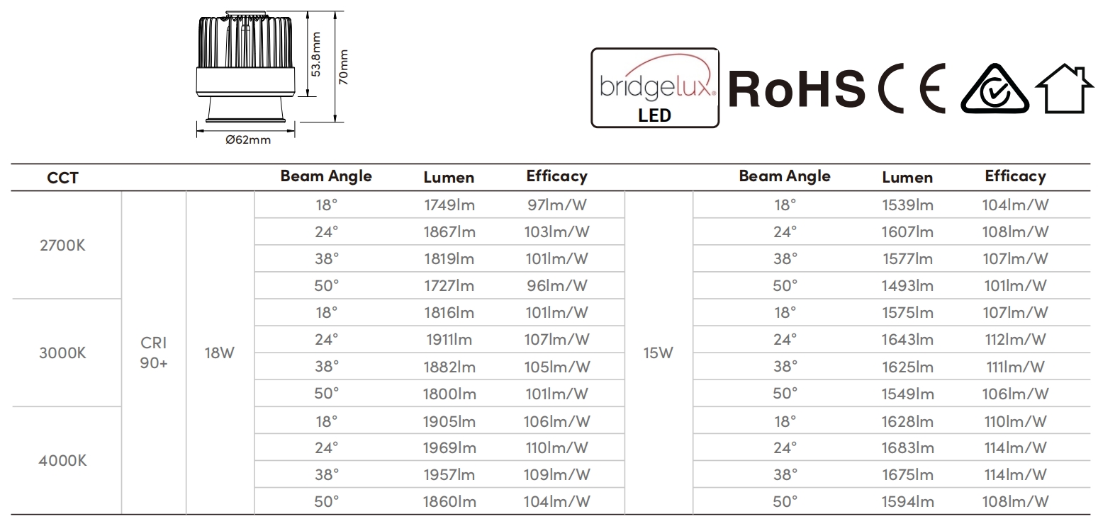 Beam Angle | 18°/24°/38°/50° |
