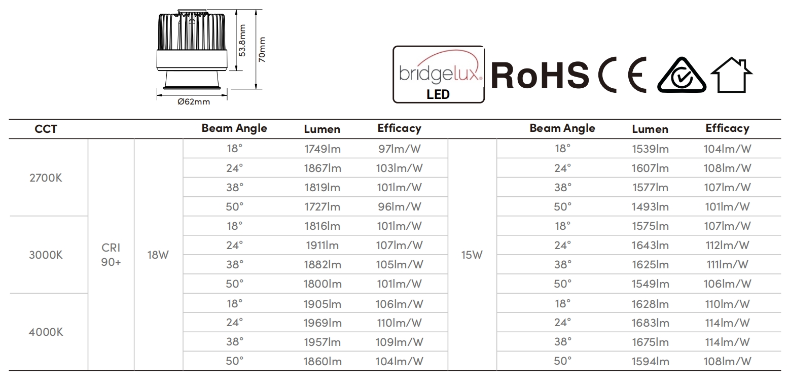 Beam Angle | 18°/24°/38°/50° |