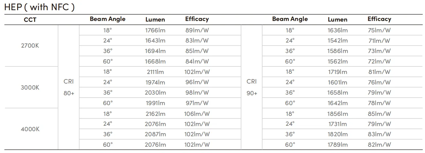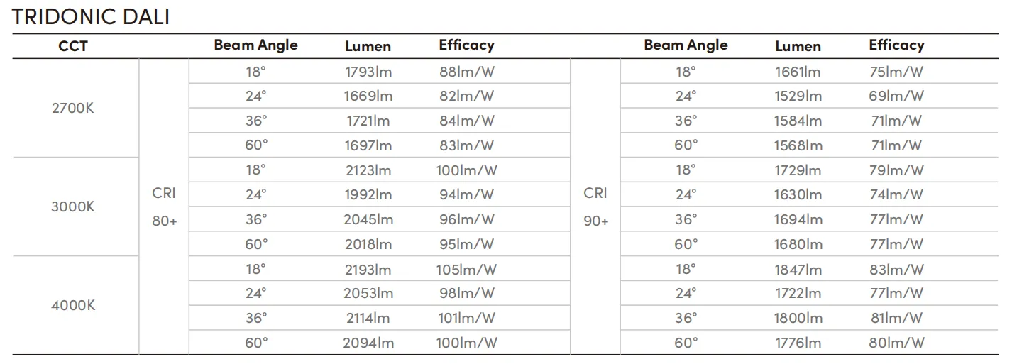 CRI | >80(HEP 20W), >90(HEP 21W) >80(TRIDONIC 20W), >90(TRIDONIC 21W) |