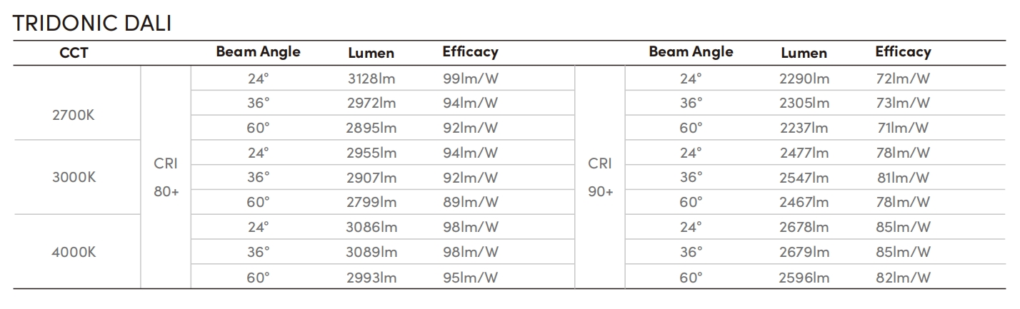 Power | 30W(HEP DALI) | 31W(TRIDONIC DALI) |